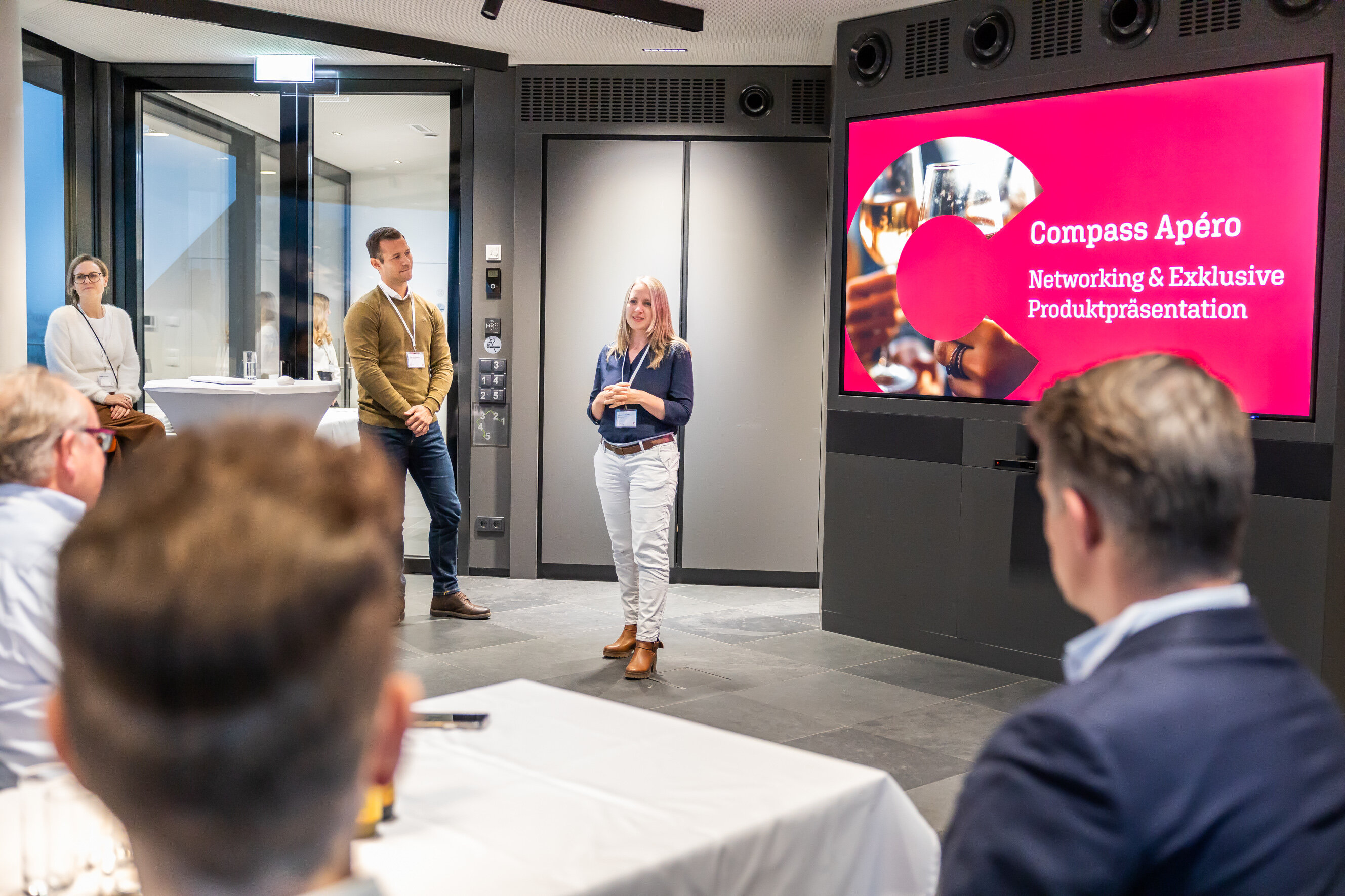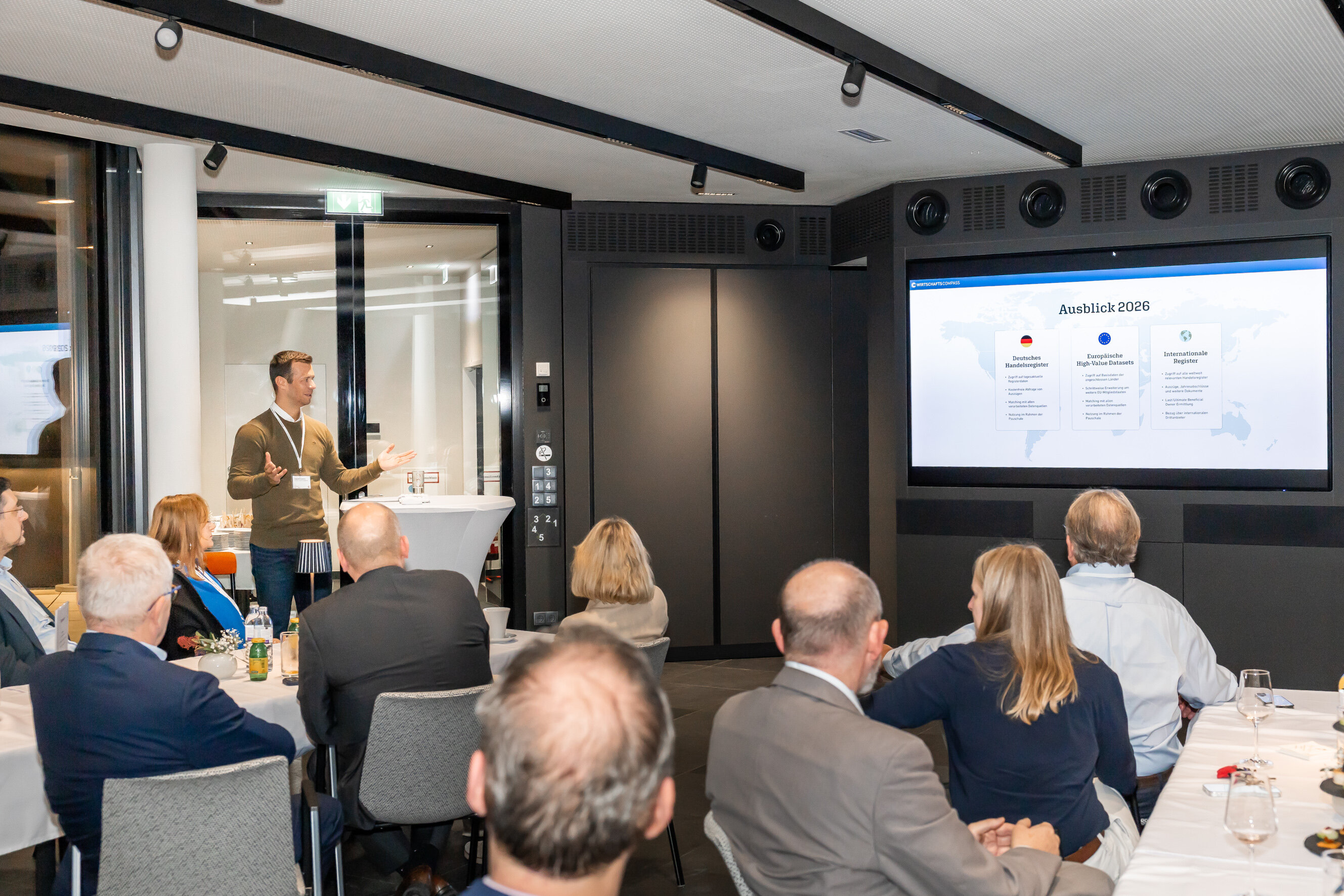 Am 13. November 2025 fand der zweite Apéro des Jahres in unserem hauseigenen CUBE statt. Nach der Begrüßung durch Hermann Futter (Geschäftsführung) und Katharina Raubek (Leitung Vertrieb) stellte Augustin Studeny (Leitung Produktmanagement), die umfangreiche Neugestaltung des Jahresberichts im Detail vor. Danach präsentierte Studeny einen exklusiven Ausblick auf die geplanten Erweiterungen im Wirtschafts-Compass.