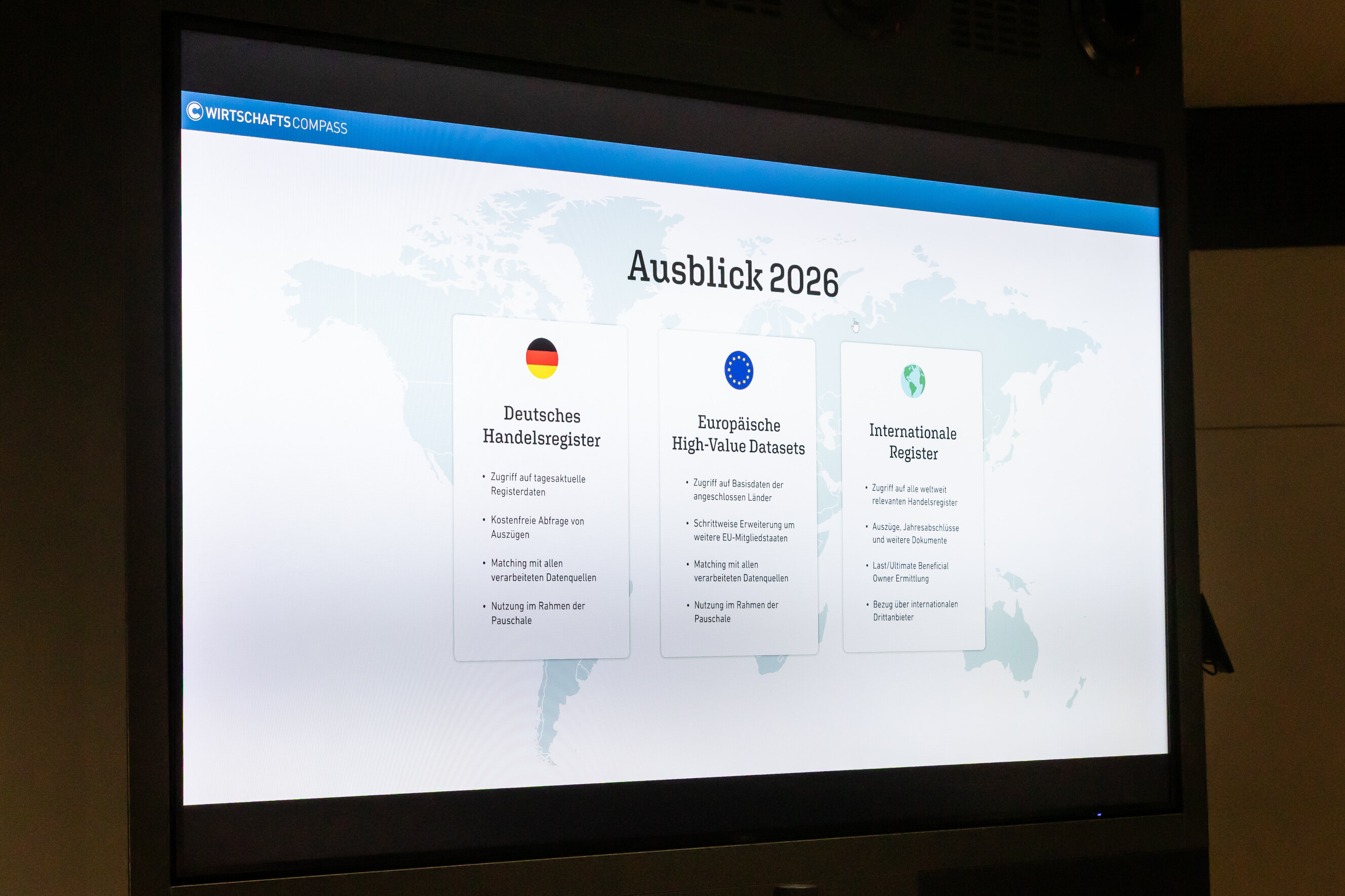 Durch die Integration des Deutschen Handelsregisters lassen sich künftig Firmenprofile, Verlinkungen zu verbundenen Unternehmen und offizielle Auszüge unmittelbar abrufen. Mit der Implementierung der internationalen High Value-Datasets (HVD) wird ein vernetztes Daten-Angebot mit tagesaktuellen Firmen-Basisdaten der EU-Mitgliedstaaten zentral und zuverlässig zur Verfügung stehen. Zum Thema Internationale Dokumente wird auf Hochtouren an einer Produktlösung gearbeitet.