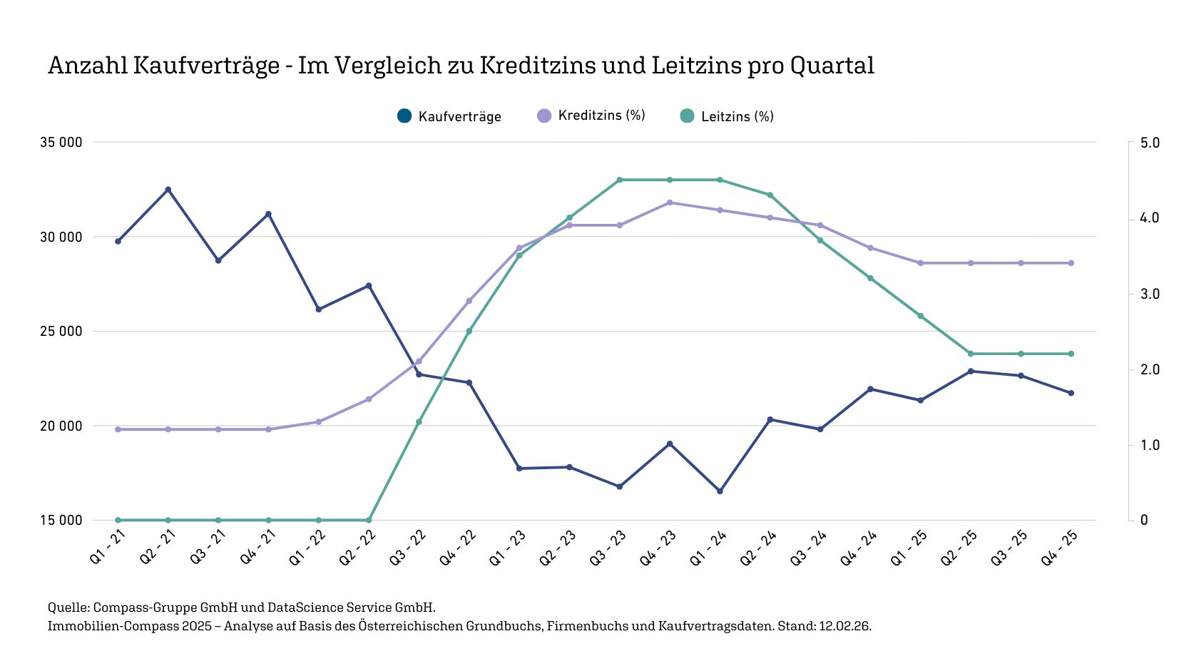 Wien, 04.03.2026 Der österreichische Wohnimmobilienmarkt zeigt 2025 eine spürbare Stabilisierung. Nach dem Zinsanstieg von 0 auf rund 4,5 Prozent zwischen 2022 und 2023 sank die Zahl der Kaufverträge von bis zu 32.000 pro Quartal auf rund 17.000. Mit der schrittweisen Zinssenkung seit Ende 2023 liegen die Abschlüsse nun wieder bei rund 22.000 bis 23.000 pro Quartal. Das geht aus dem aktuellen Immobilien-Compass 2025, den die Compass-Gruppe gemeinsam mit DataScience Service veröffentlicht hat.